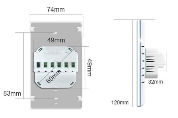 The models have the same recessed housing sliding into the wall, sized 50x50mm, with rounded corners creating a diameter of about 59mm. This makes them suitable for both EU and US wall fixtures. The EU model fits in a properly deployed, standard 60mm round wall box and can be fixed with two side screws (use the screws which belong to the box instead of the ones shipped with the device), the US model fits in the standard rectangular box and can be fixed through the oval holes located 3 1/4" apart. The depth of the wall box has to be at least 35-40mm because some room is needed for the wires coming out straight of the device.